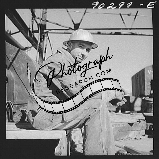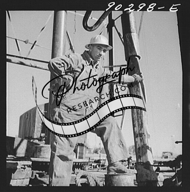 Title: T.J. Schenermann, driller from Oklahoma, worked in Kansas oil fields about fifteen years; by oil well being drilled in Goodrich field of Continental oil field near Wichita, Kansas