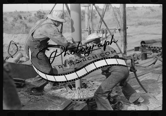 Title: Adding a length of drilling pipe at oil well in Seminole oil field, Oklahoma. Wrench applied to loosen pipe