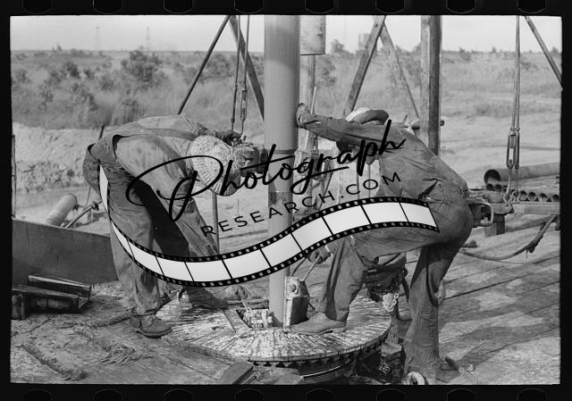 Title: Adding a length of drilling pipe at oil well in the Seminole oil field, Oklahoma. Clamps are put in place; wrench applied to loosen pipe; mud spurting out as the sections of pipe are loosened; freed is moved over to rat hole; lower end of traveling block is attached to pipe in rat hole by means of rope operated off winch. This entire operation takes from twenty to thirty seconds