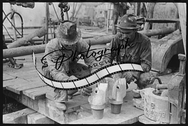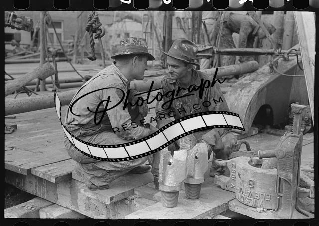 Title: Oil field workers squatting down while talking to bit salesman, Kilgore, Texas