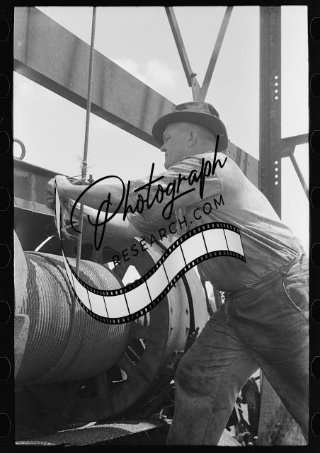 Title: Cable tool equipment with operator. Oil well near Saint Louis, Oklahoma. This is equipment used in drilling