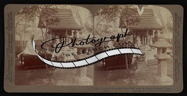 A priest of the ancient Shinto faith before the shrine of his gods, Tokyo, Japan