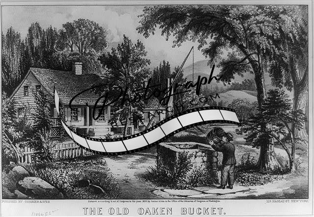 The old oaken bucket,c1872,Currier & Ives,photo,well,cottage,man,trees