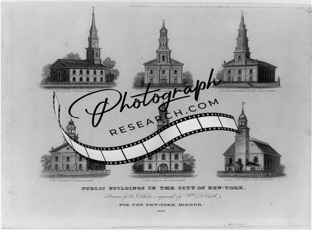 Public buildings,churches,religious,city,Mirror,spires,doors,New York,NY,1830