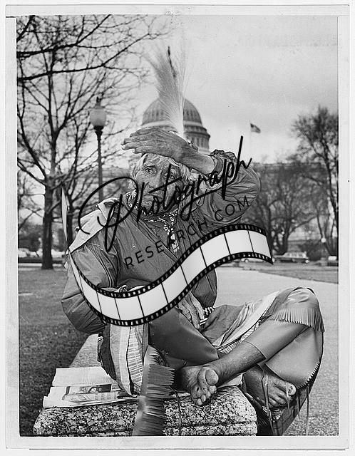 Capital powwow, Seminole councilman George Osceola, full-length portrait, seated, with the United States Capitol in the background.