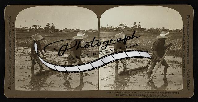 Harrowing the mud of the rice fields--Japanese man drawing the harrow, his wife guiding it. Shizuoka, Japan