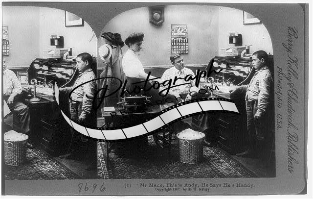 Mr. Mack,this is Andy,He says he's handy,office,c1907,desks,people