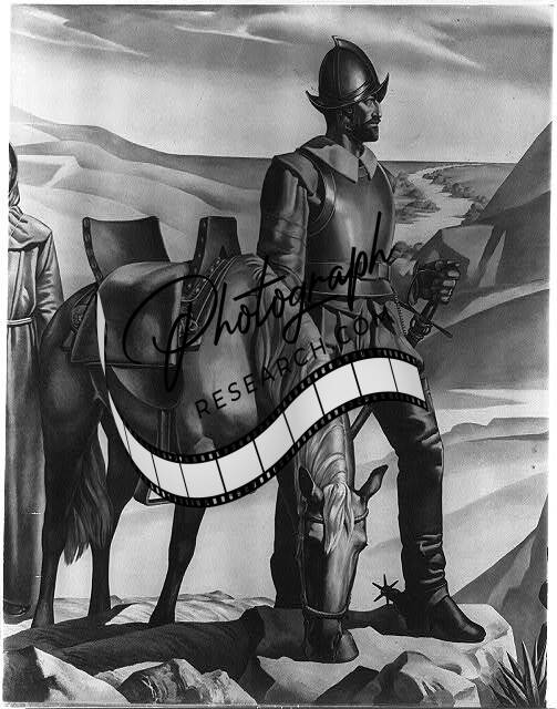 Spanish soldier in armor with horse; exploring Southwestern U.S.