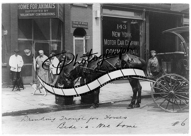 Bide-A-Wee Home for Animals,New York,N.Y.,horse drinking from trough,c1907,dogs