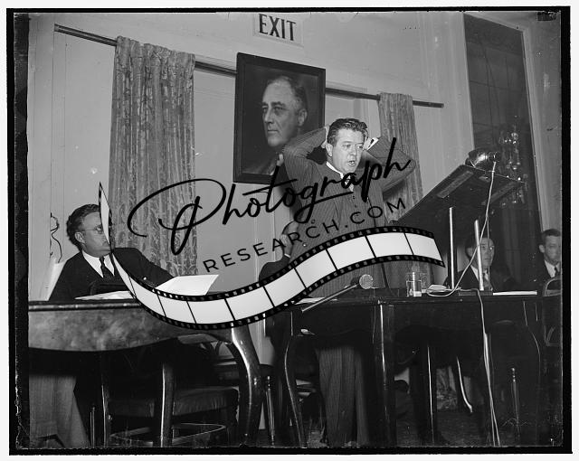 Title: Opens Labor Nonpartisan League Convention. Washington, D.C., March 8. With labor leaders from all sections of the country, Maj. George L. Berry, President of the Labor Nonpartisan League, is shown presiding at the opening session of the League's convention in Washington today. The convention will mark the climax of an intensive campaign by the League to show congress and the country that labor is solidly behind the President in his efforts to modernize the federal Judiciary, 3/8/1937