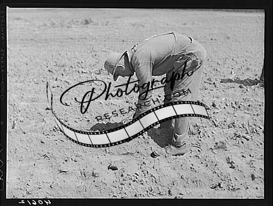 Title: Negro woman planting tobacco. In her right hand a tobacco plant and in her left a 'peg' for planting it. Near Farrington, Orange County, North Carolina