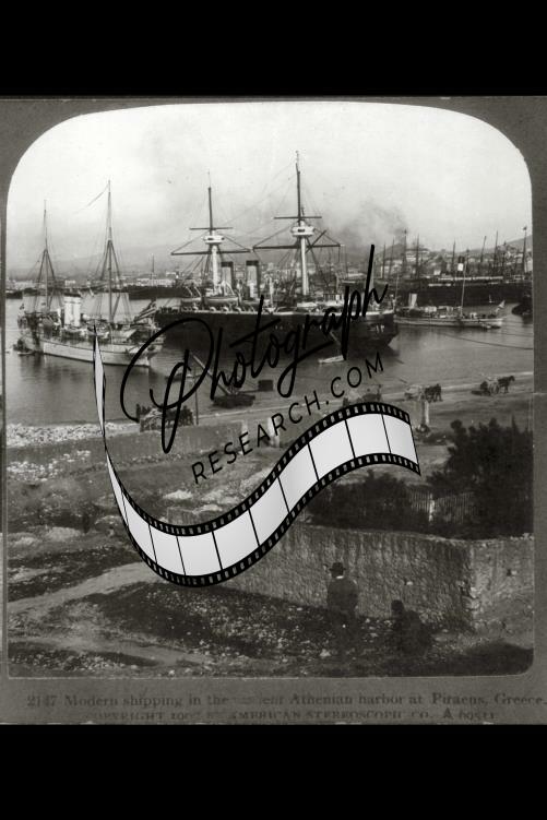 Modern shipping in the ancient Athenian harbor at Piraeus,Greece,January 1907