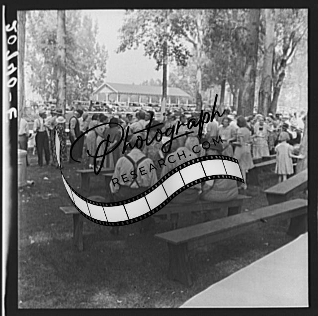 Title: Oregon, Josephine County, Grants Pass. 'California Day.' A picnic in town park on the Rogue River. Hot summer afternoon in summer. Participants register