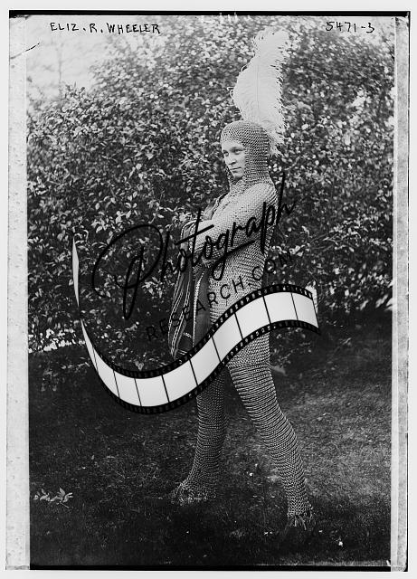 Elizabeth R. Wheeler,wearing chain-mail costume,armor,women,outdoors,trees