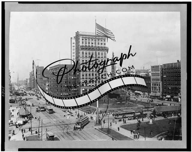 Public Square,monument,department stores,banks,trolley cars,Cleveland,OH,c1906