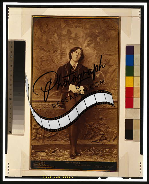 Summary: Oscar Wilde, full-length portrait, standing with hands behind back, facing front, leaning against a wall.