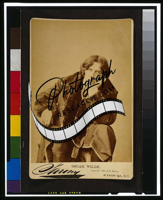 Summary: Oscar Wilde, head-and-shoulders portrait, facing right, wearing coat with fur collar.