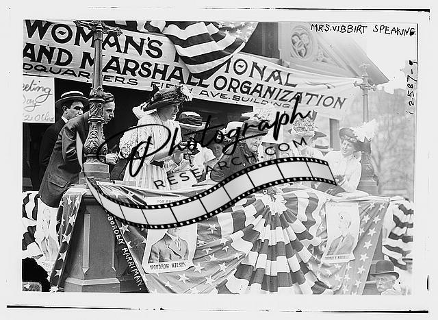 Mrs. Vibbirt speaking,1910-1915,Mrs. Borden Harriman,American flag