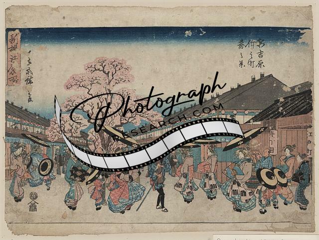 Summary: Print shows Wakamatsu of Okawara-ya, a courtesan, full-length, walking, turned to the right, with several young apprentices walking with her.