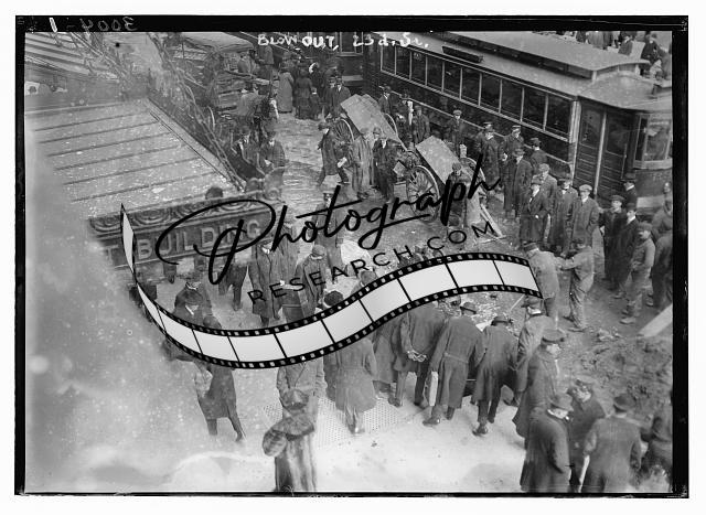 Blow-out 23rd Street,1910-1915,people,trolley cars,people,policeman,store