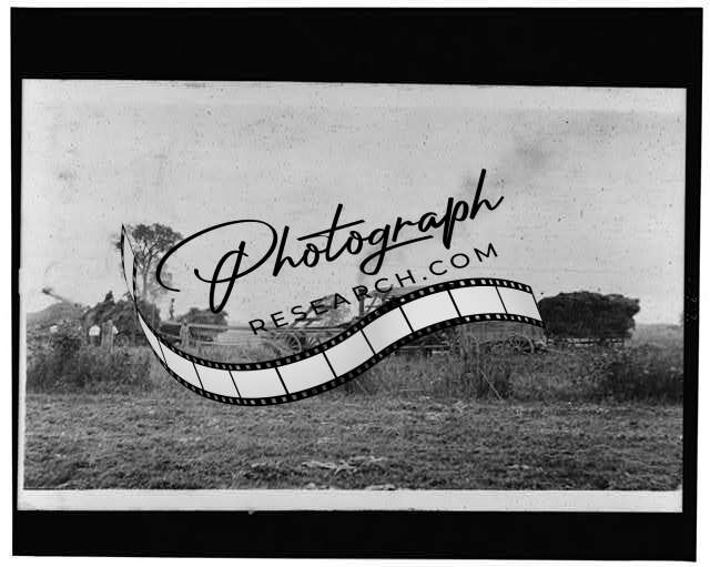 Farm workers piling hay onto wagon being pulled by farm machinery, horses hitched to wagon stand near