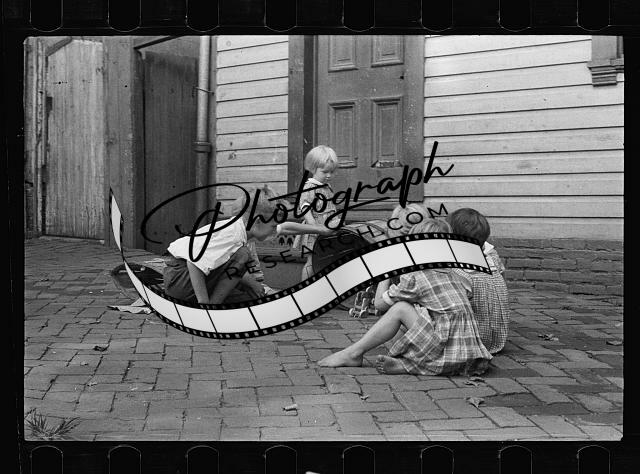 Poor white children playing,sidewalk,building,toys,Georgetown,Washington DC,1935 1