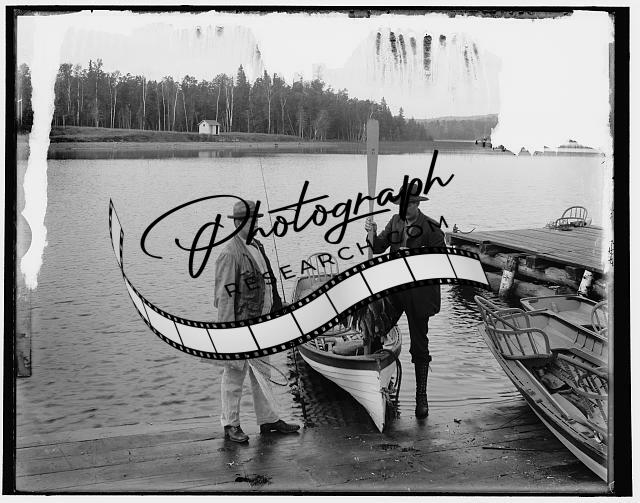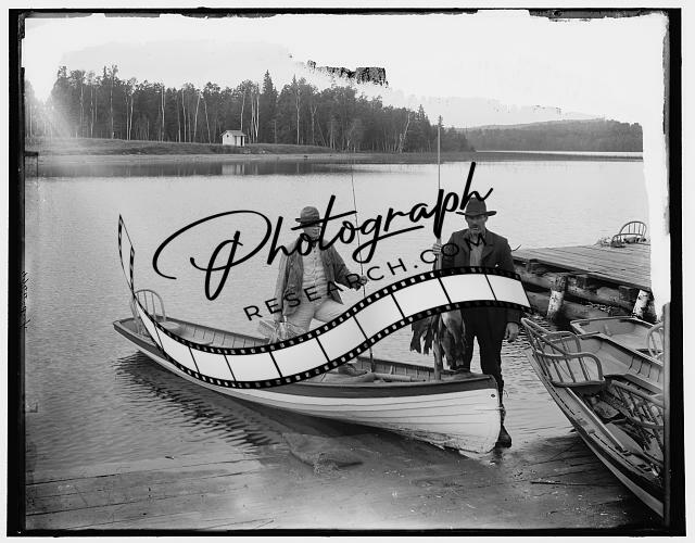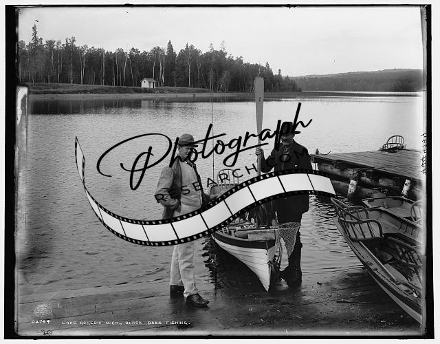 Black bass fishing,canoes,boats,docks,pier,Lake Gogebic,Michigan,MI,1880