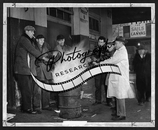 Outdoor workers,wholesale produce district,standing around bonfire,1950,New York
