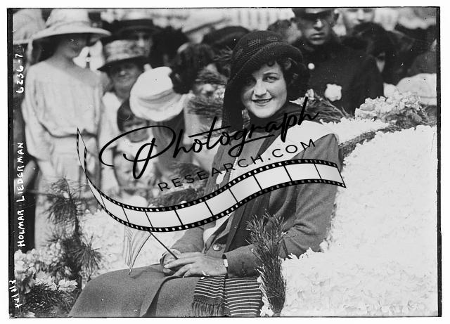 Holmar Liederman holding American flag,sashes,pins,women,hats,flowers,1924