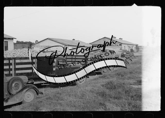 Trucks with grapefruit wait to be unloaded,juice plant,Weslaco,Texas,TX,1942