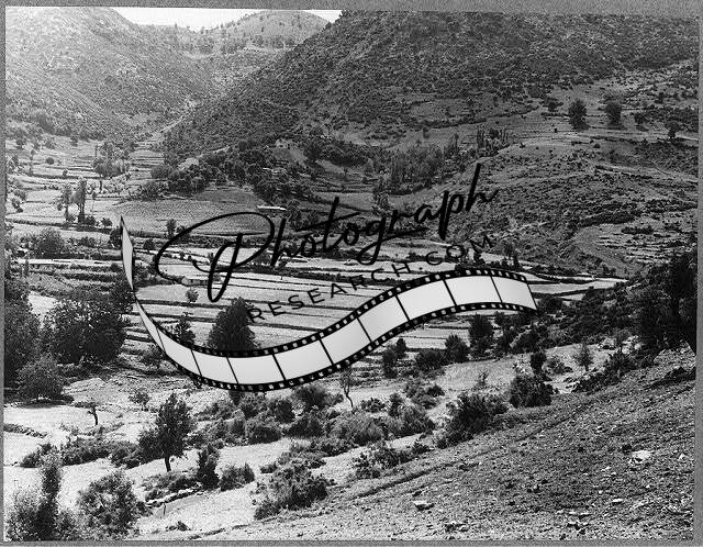 Sloping terraced wheat lands near Priolithos,eroded mountain in background,1946