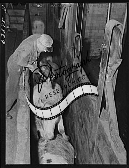 Title: Beef cattle. Part of skinning and cleaning process. Packing plant, Austin, Minnesota