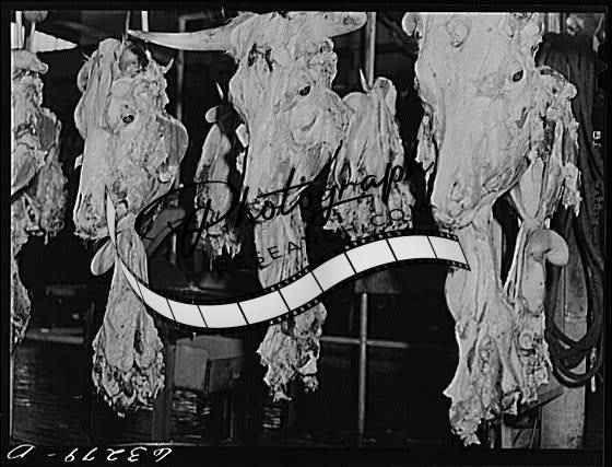 Title: The beef kill. Cattle are knocked out by a blow on the head before they are shackled and decapitated. Austin, Minnesota