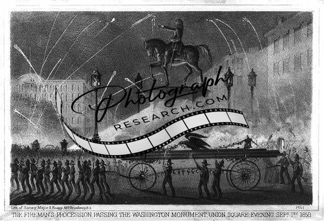 Washington monument,Union Square,1858,fireman,fireworks