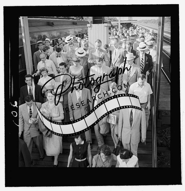 Commuters,platform,getting off train,railroad stations,Park Forest,Illinois,1954