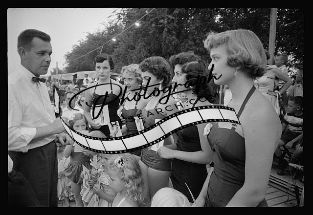Women,girls,swimsuits,numbers,judged,beauty contest,Park Forest,Illinois,IL,1954