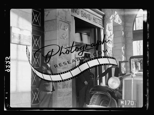 Title: Palestine disturbances 1936. Lieut. General Dill (left) & H.E. (i.e., His Excellency) the High Commissioner (right) leaving the memorial altar, preceded by the Anglican Bishop, George Francis [Mount Scopus]