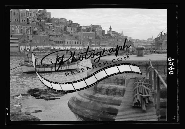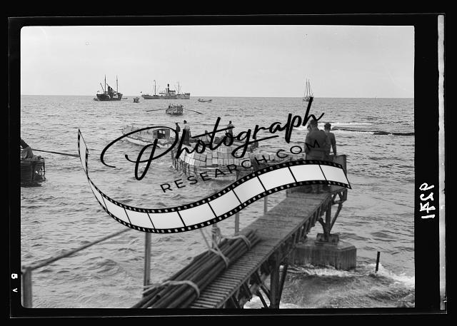 Title: Palestine disturbances 1936. Dredging entrance channel of the Tel-Aviv Lighter Port is seen in distance