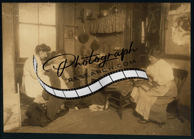 Title: Pallagi (?) family finishing pants, 17 Monroe St., N.Y., 2nd floor front. None of them spoke any English. A neighbor's child said the young girl is 13 yrs. old. Photo taken at 2:45 P.M. Mar./6/12, a school day. In the next apartment, a 12 yr. old girl was finishing pants and explained, 'I came home with the toothache.' New York, New York (State)
