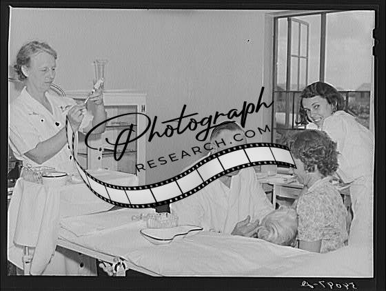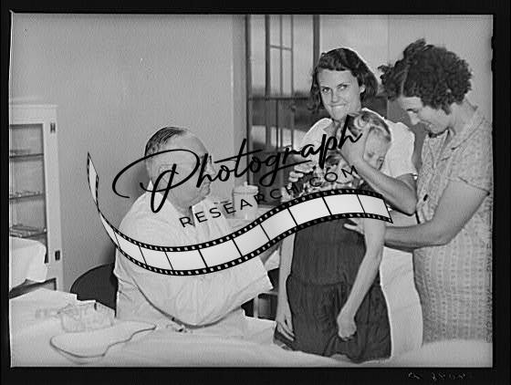 Title: Dr. William J. Buck and nurse Anne Smock dressing infection on child's foot in clinic at Osceola migratory labor camp. Belle Glade, Florida