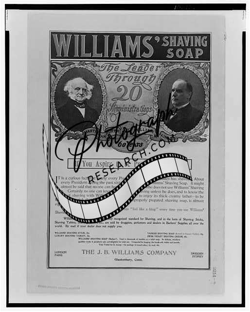 Williams' shaving soap,leader,20 administrations,ads,M Van Buren,McKinley,1901