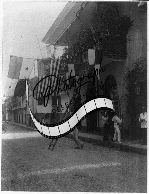 Panama during Panama Canal Construction,Flags over street,men carrying ladders