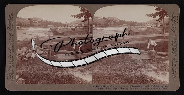 Village church and homes of Kongsberg, beside the bridge-spanned rapids of the L