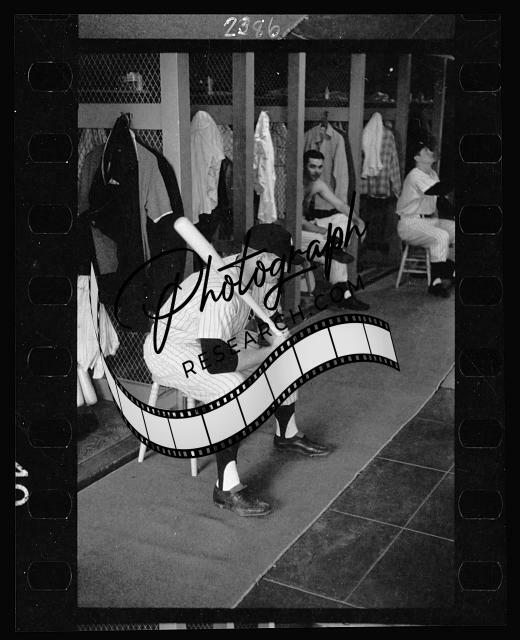 Mickey Mantle, New York Yankee baseball player, in uniform, sitting in locker room holding a bat