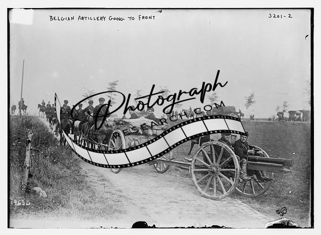 Belgian Artillery going to front,horse drawn wagon,men on horseback,Military