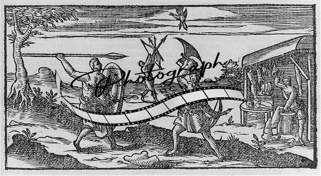Mexican Indians fighting with spear,ax,shield,hunting birds,cannibalizing,1624