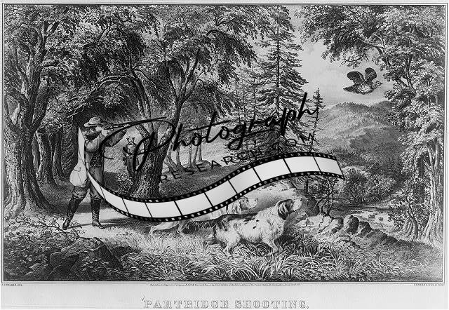 Partridge Shooting,c1865,hound dogs,hunters,rifle,Frances F Palmer,photo,woods