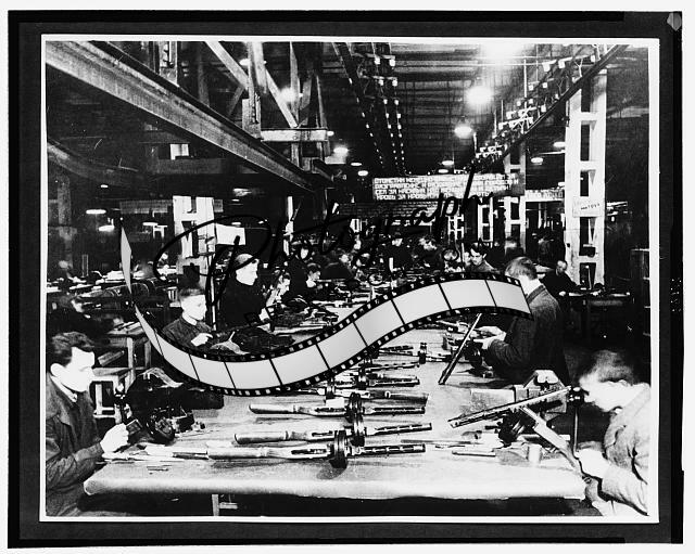 Russian workers assembling small machine guns in factory. Patriotic anti-Nazi slogan on banner in background
