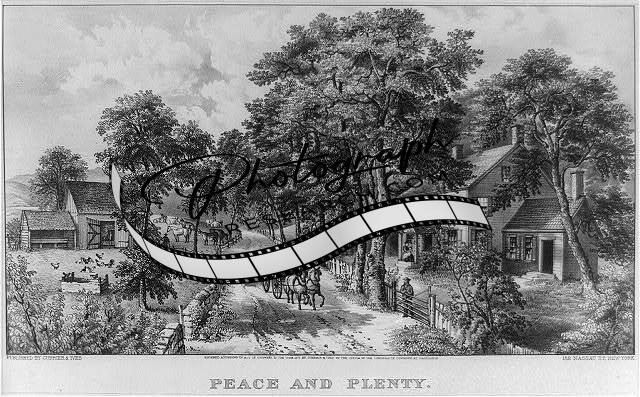 Peace and Plenty,c1871,Currier & Ives,Photograph,horse-drawn cart,houses,road