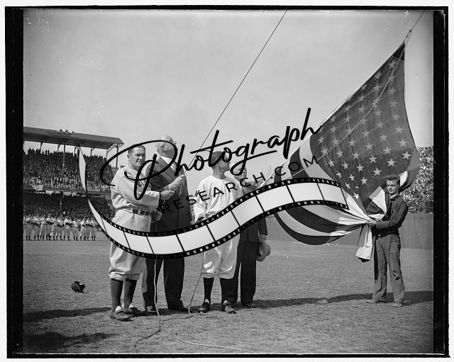 Title: The ball goes out and the game is on. Washington, D.C., April 21. Baseball really isn't ushered in until the ceremony of throwing out the ball is accomplished. Vice President John Garner did the honors today in the absence of President Roosevelt. Left to right. Senators Pat Harrison, Robert Lafollette Jr., Charles L. McNary, Carter Glass, the Vice President, Bucky Harris who manages the Washington Senators, Postmaster General James A. Farley, N.Y. Yankees' Manager Joe McCarthy. Senator Allen J. Ellender is standing behind the Vice President